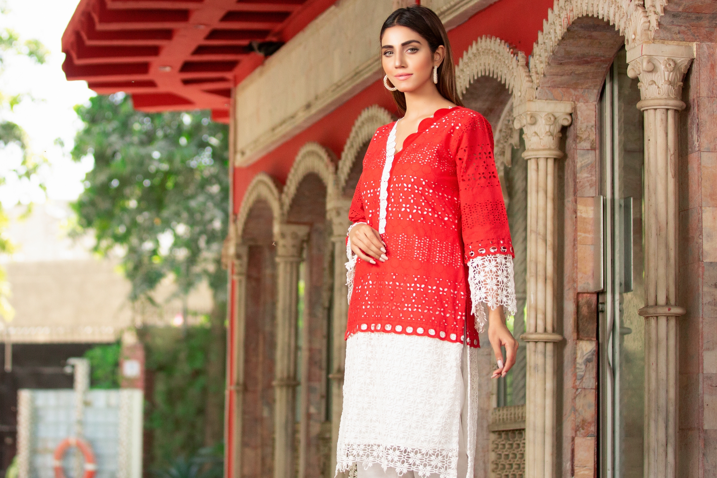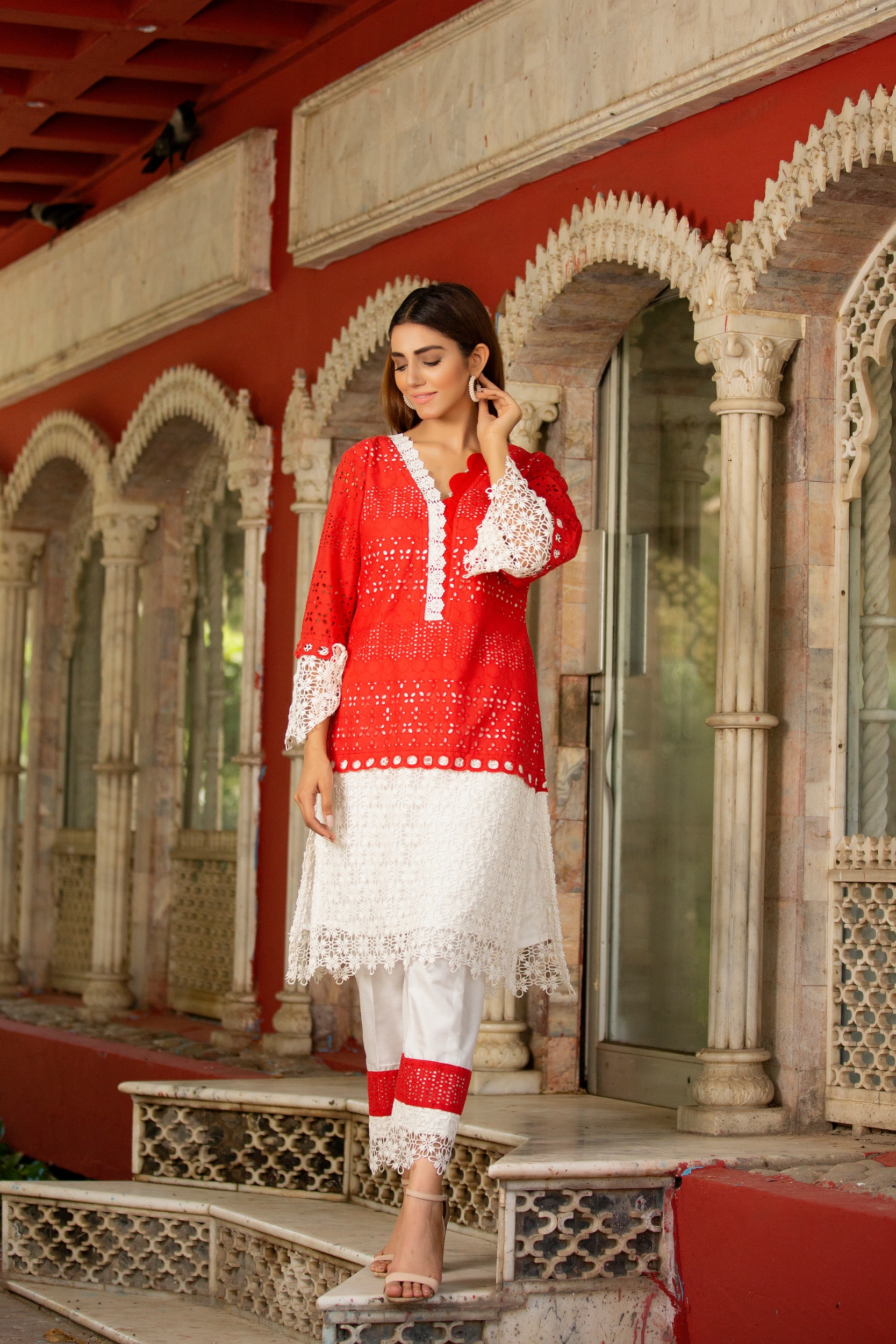 Step into this scroching summer in this crisp  color schiffli eyelet tunic, embellished with laces paired with white cotton silk trouser. * Pattern  of lace or embroidery may vary.